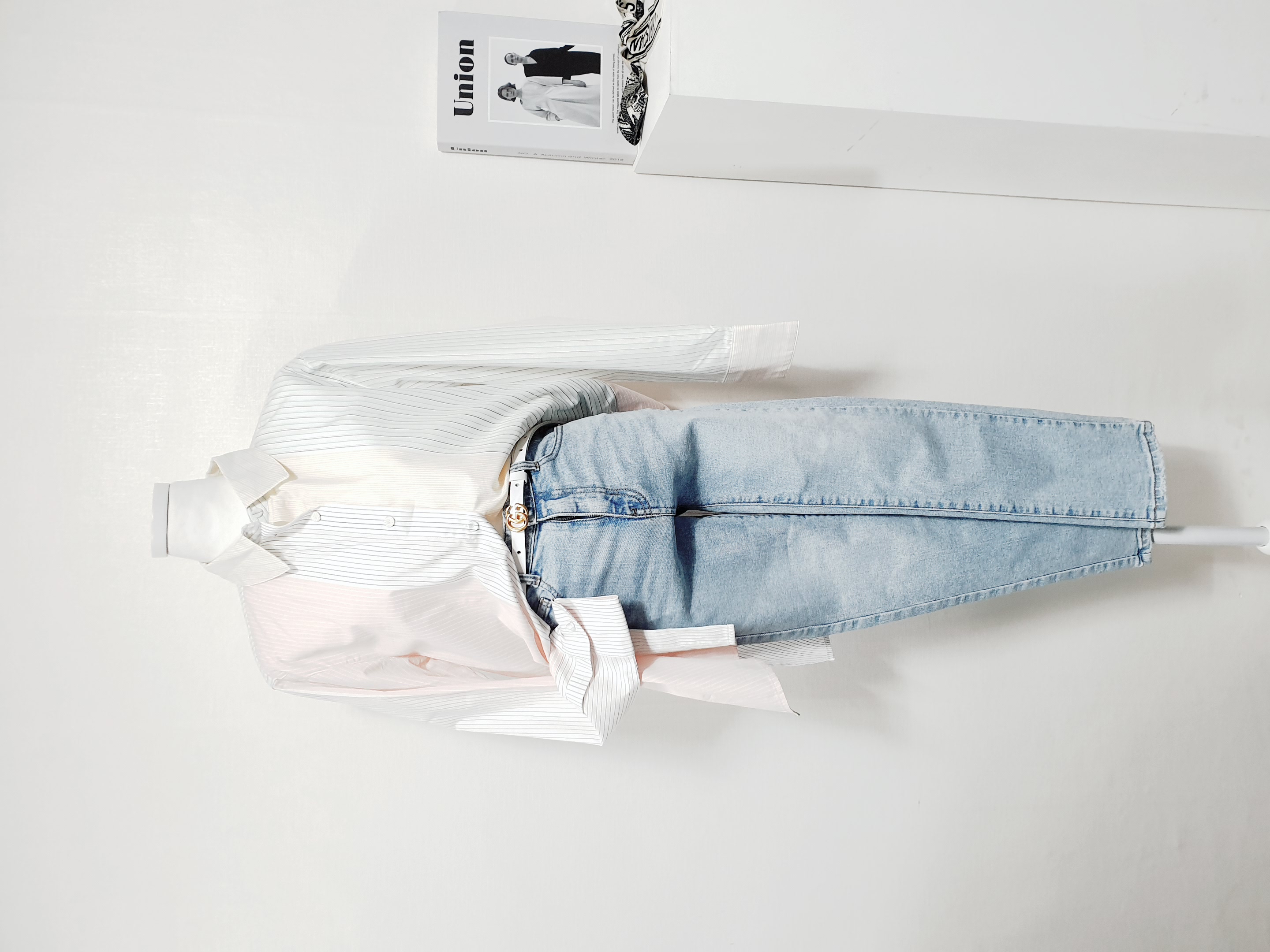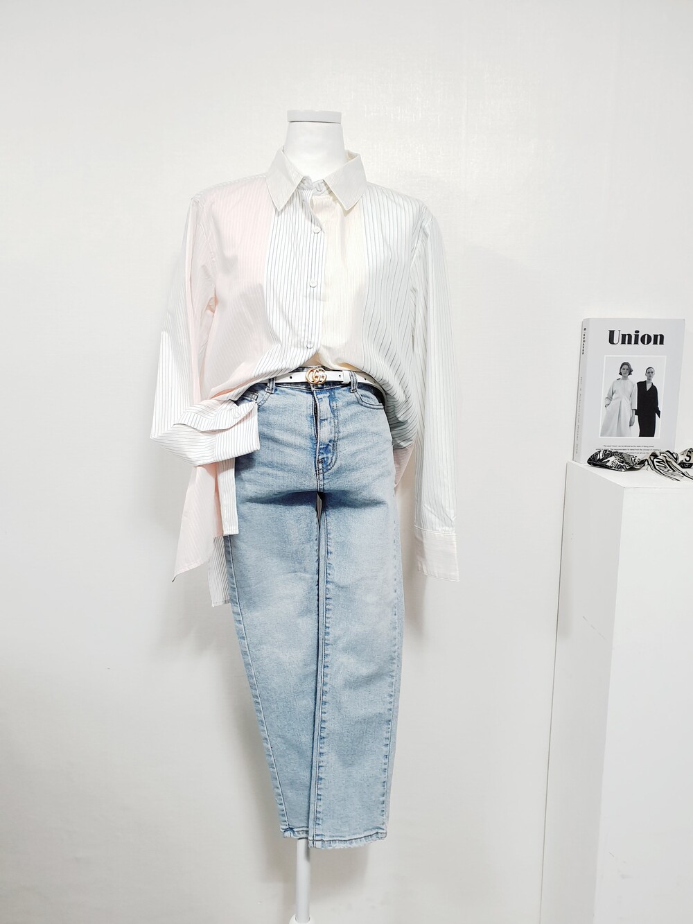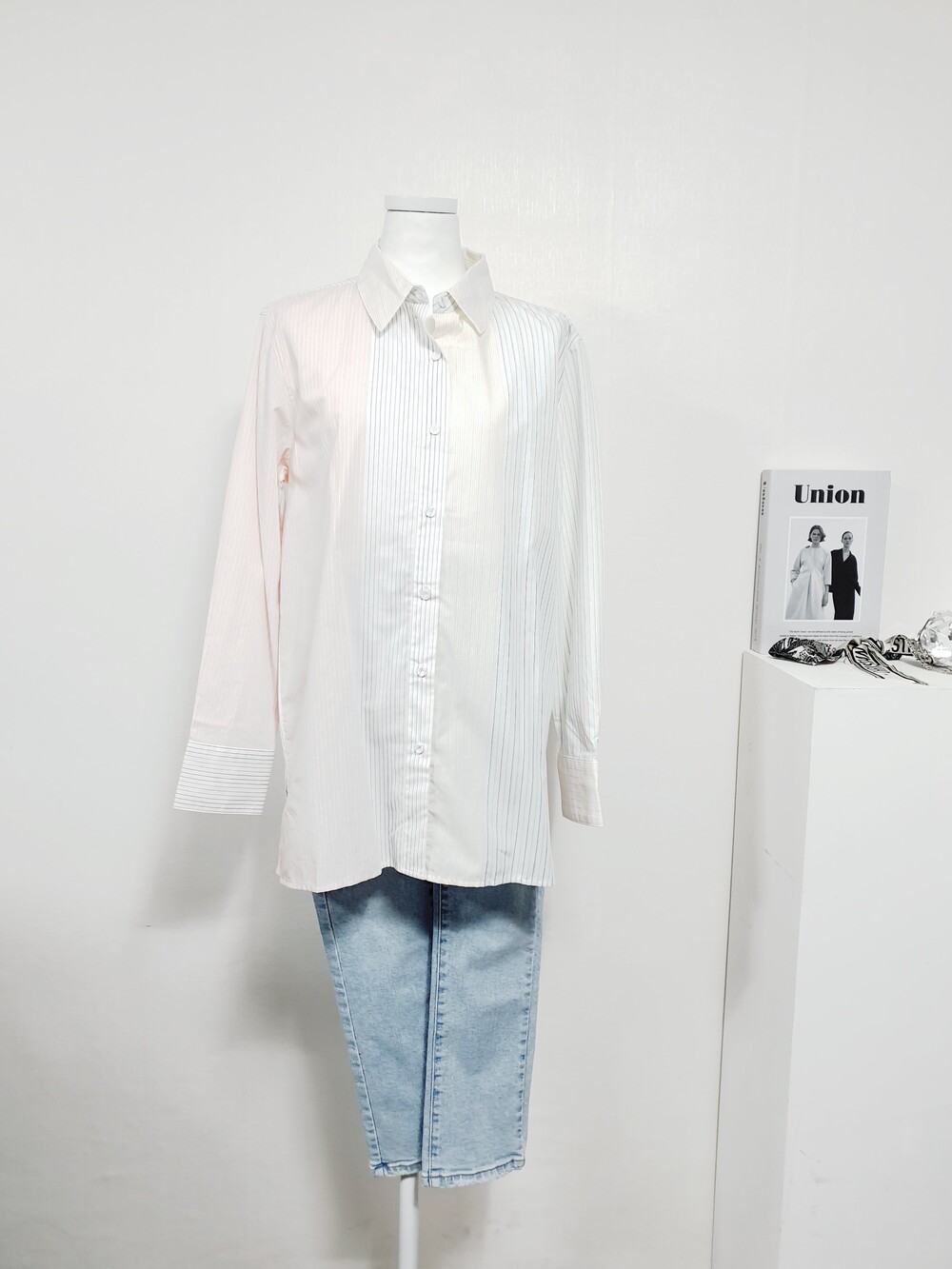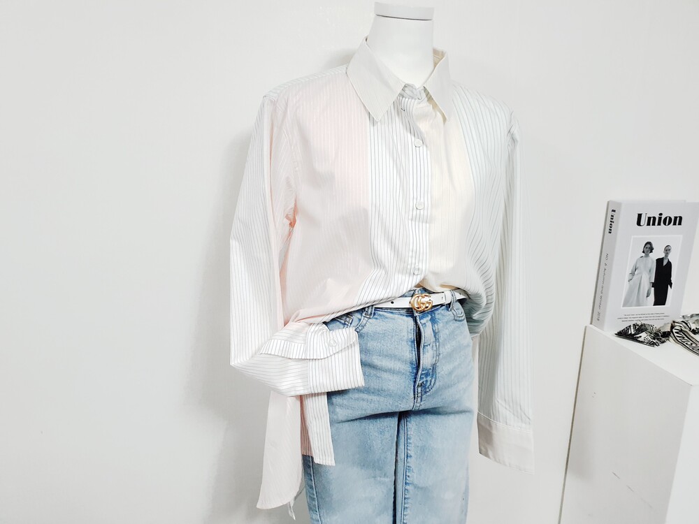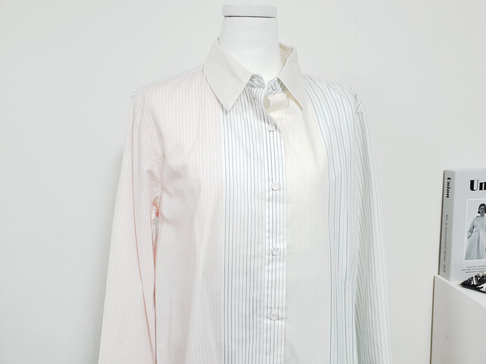 【 M 】IZEL 쿼터 배색 스트라이프 파스텔 셔츠블라우스